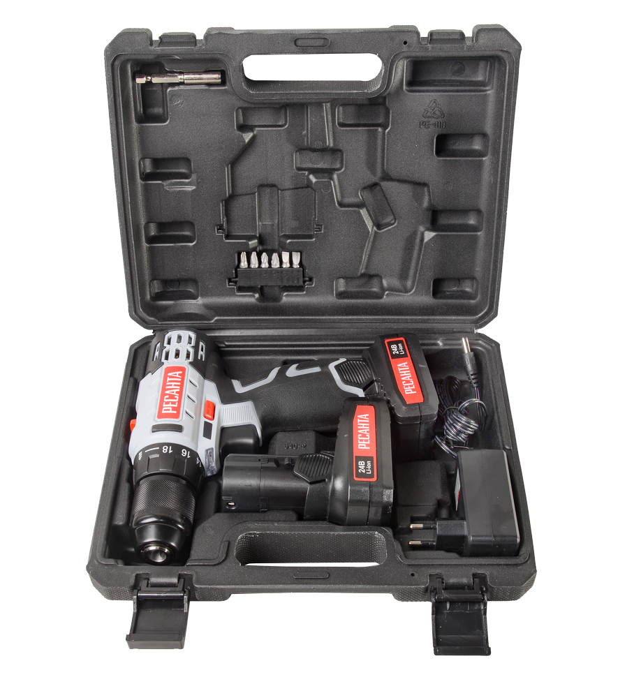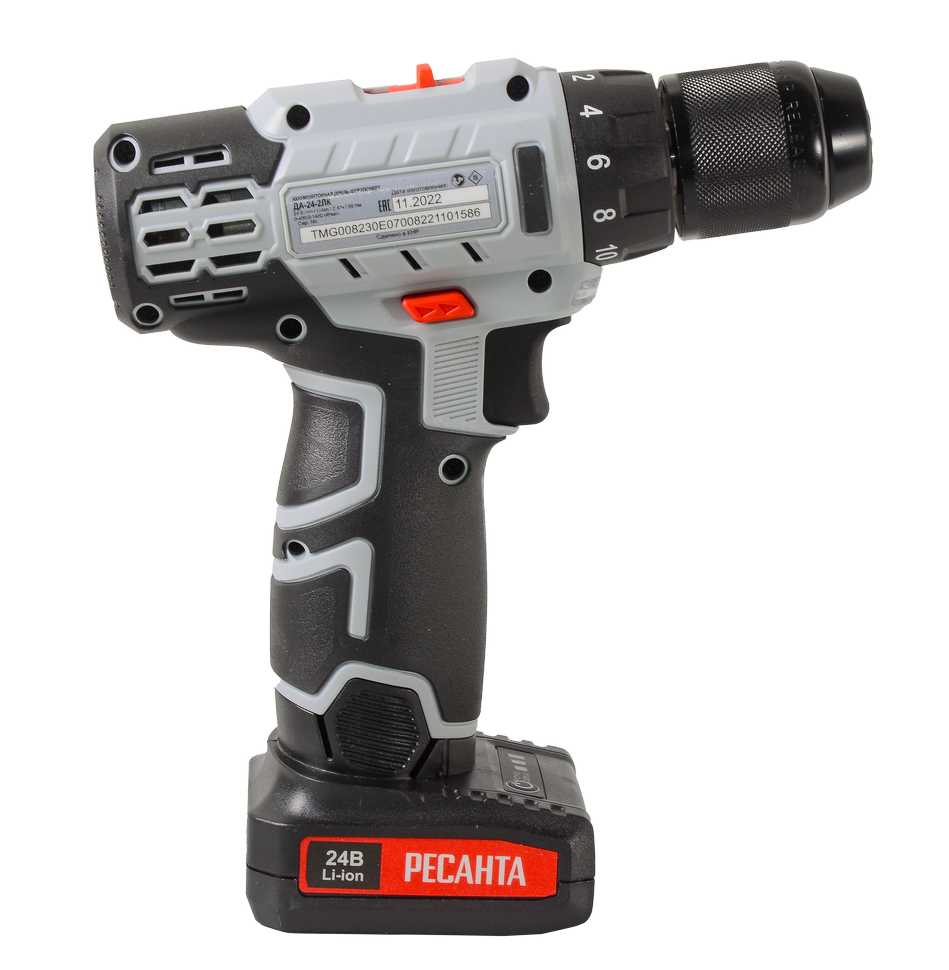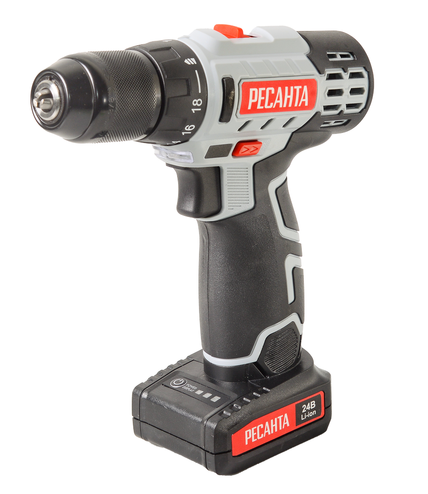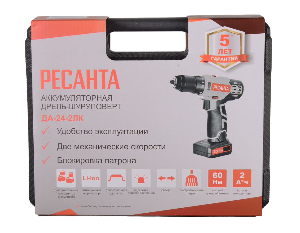 Дрель-шуруповерт аккумуляторная ДА-24-2ЛК Ресанта – незаменимый помощник мастера в ремонте или строительстве. Электроинструмент является аналогом модели ДА-24Л-2, отличие: есть кейс и второй аккумулятор. Прибор аккуратно сверлит отверстия на поверхностях из дерева и металла, а также накрепко закручивает шурупы. В комплект к дрели-шуруповерту поставляется удобный кейс, в котором можно хранить инструмент, зарядку к нему и другие рабочие детали. Не требует подключения к сети, что позволяет использовать ее в помещениях, где нет доступа к системе электропитания. Рабочие элементы легко заменить благодаря быстрозажимному патрону. Для ослабления креплений и выкручивания шурупов есть обратный ход. Форма рукоятки удобная, с резиновыми вставками, не скользит в руке. Система охлаждения мотора за счет вентиляционных отверстий на корпусе. Щёточный двигатель, две скорости (0-400 об/мин и 0-1400 об/мин). Модель работает от надёжного литий-ионного аккумулятора (Li-Ion).