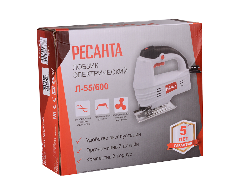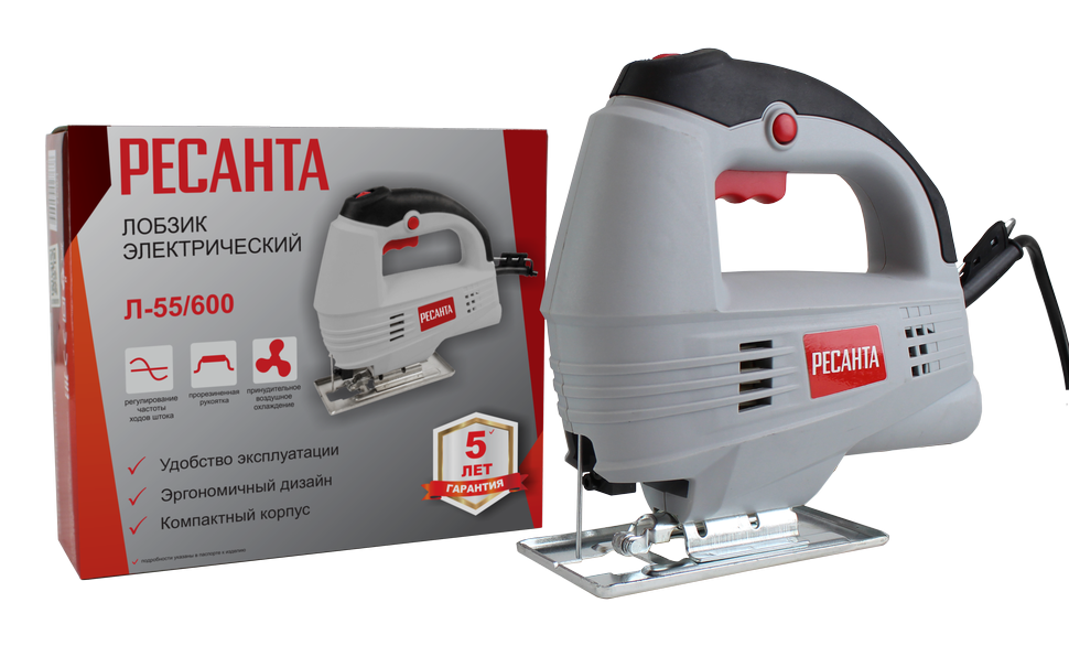 Лобзик электрический Ресанта Л-55/600 - ручной электроинструмент, предназначенный для резки пиломатериалов, строительных и мебельных плит на основе древесины, листового металла, пластмассы и других материалов. В качестве режущей оснастки в лобзиках используются специальные пилки.