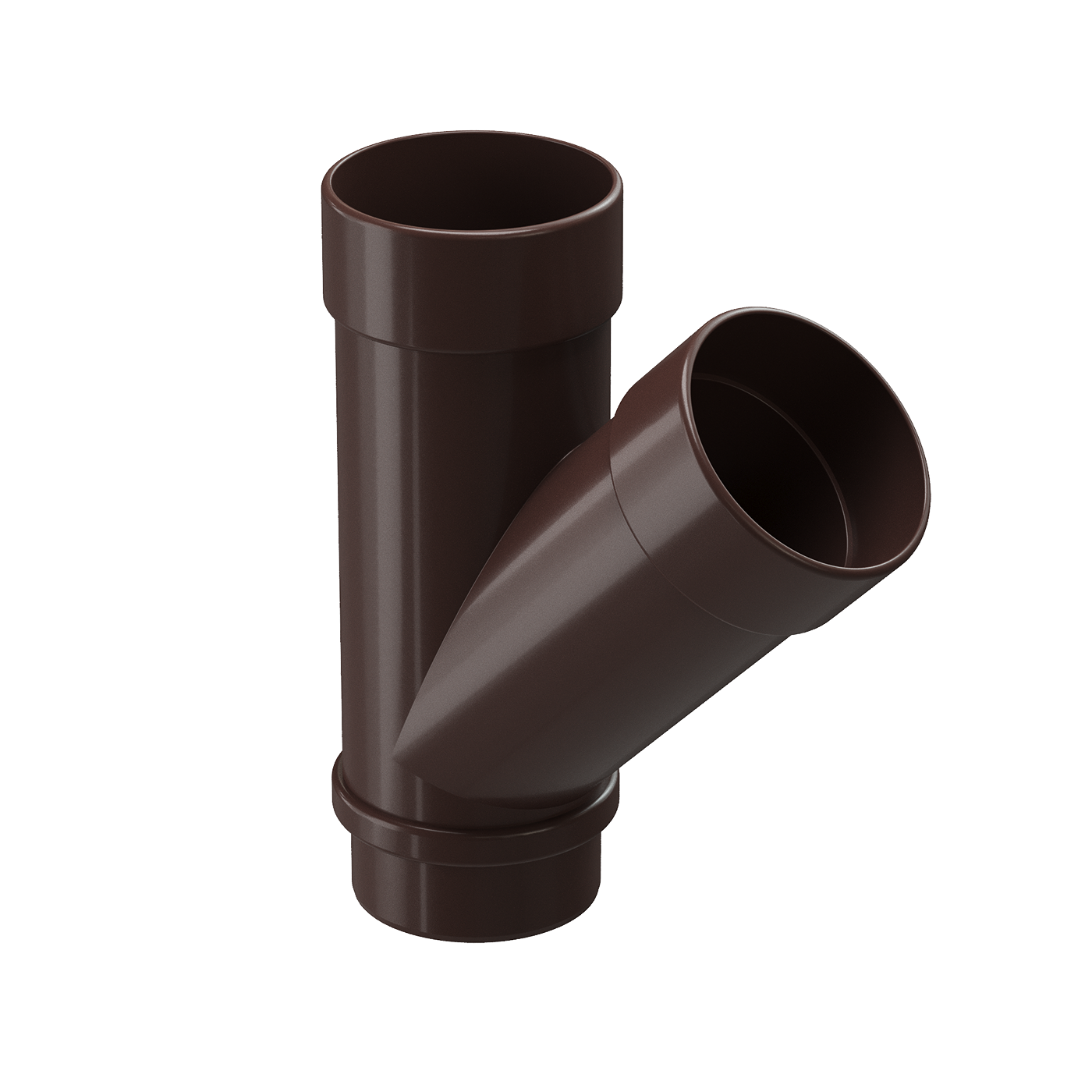 В тройник водосточной трубы вставляется три трубы диаметром 100 мм, как видно из названия. Труба от одной из воронок желоба вставляется вертикально, как и водосточная, труба от второго желоба вставляется под углом 45 градусов.